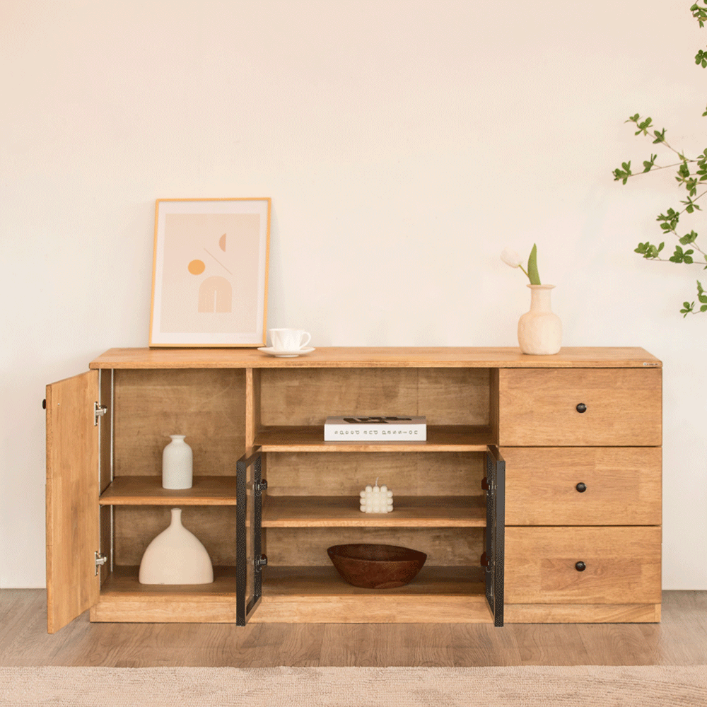 The natural grain of the solid wood with its knots, nicks, and visual imperfections are celebrated in this organically perfect piece of furniture. Colour varying tones make a statement that allows this piece to blend in well with lots of other materials and settings for that chic, organic feel at home.