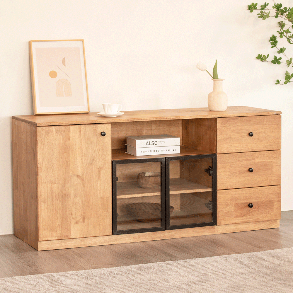 Introducing the HARU Solid Wood TV Console. This elegant console is crafted from solid wood with a traditional design that will complement any décor. It features a transparent glass door that allows you to display your electronics, while ample storage space provides plenty of room for your media collection. The console is available in eight colors to suit your style, and it makes a perfect addition to any living room or family room.