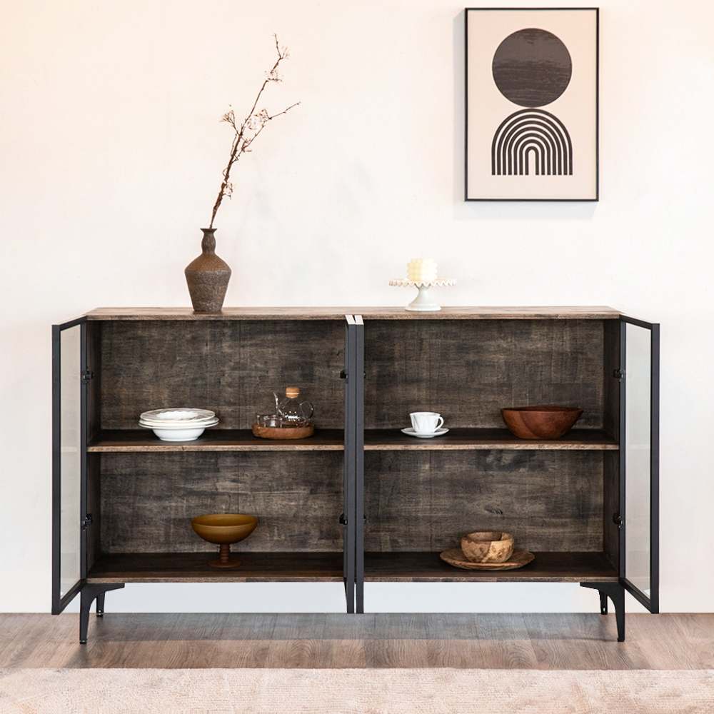 It features swing out doors for ample storage space and transparent glass doors for display.