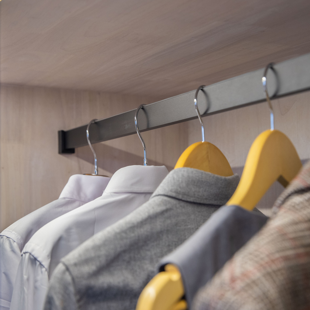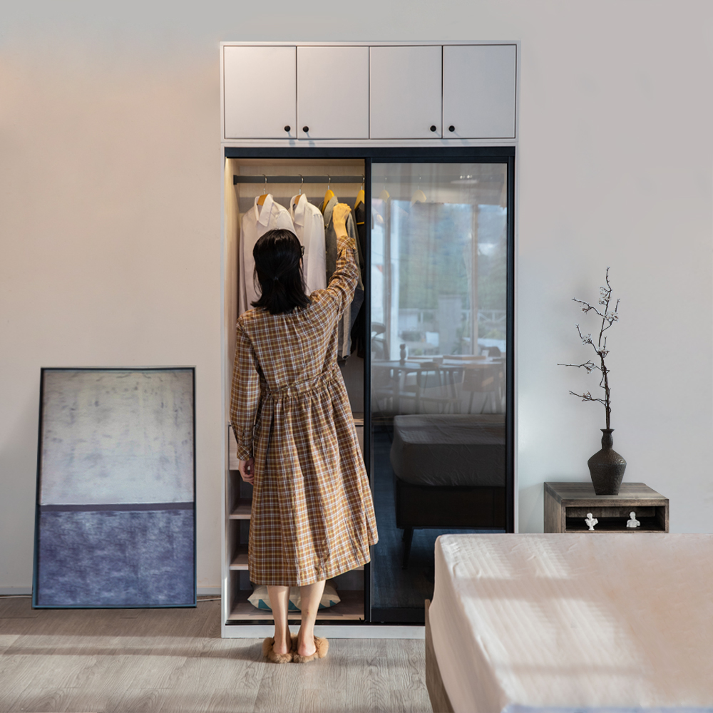 This closet features a glass door which makes it easy to find your belongings, and the flexible design means you can fully utilise the space inside.